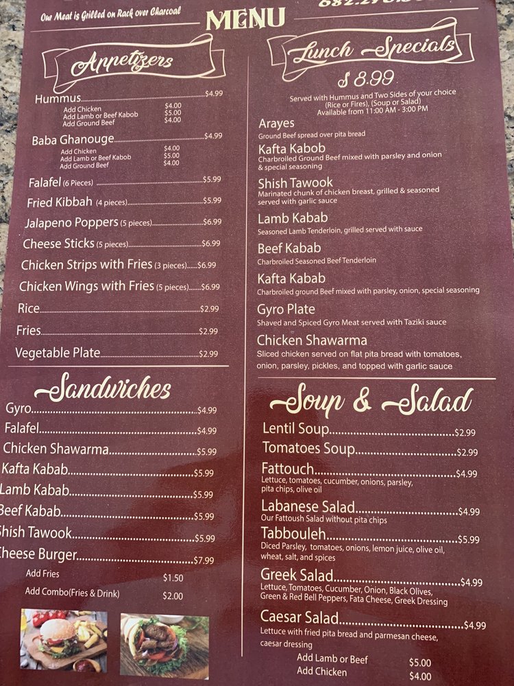 Served with Hummus, Baba Ghanouge, grilled onions, grilled tomatoes, two sides: Rice or Fries, Soup or Salad. 3 Skewers Lamb or Beef Kabab 3 Skewers Kafta Labab3 Skewers Shish tawook