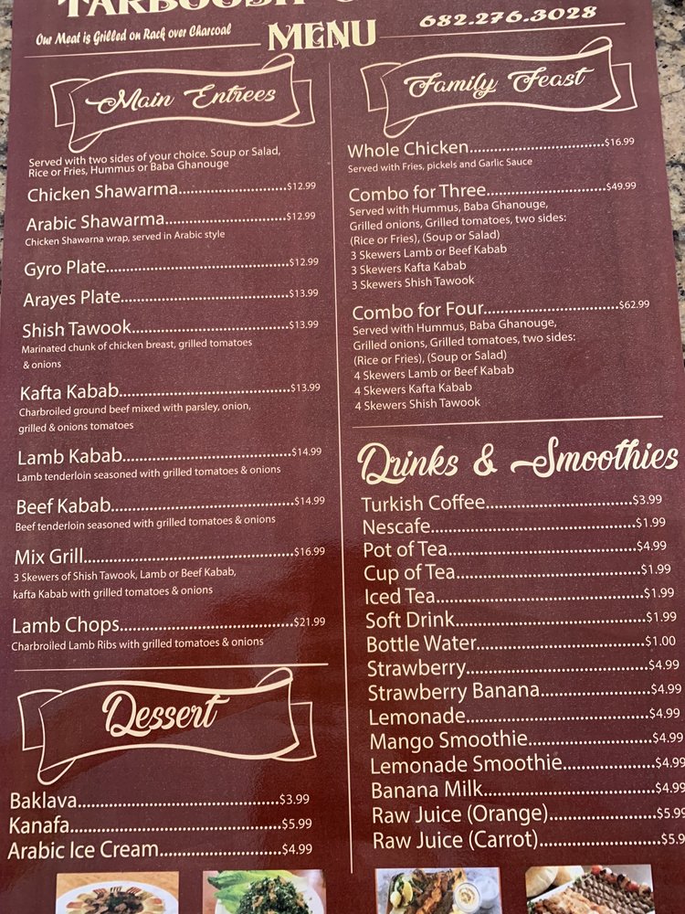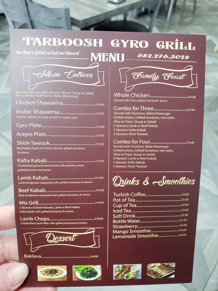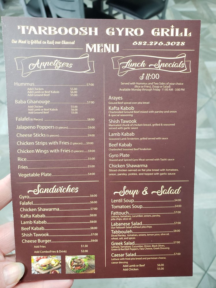 Welcome to Tarboosh Gyro Grill, a Mediterranean gem located at 4300 Matlock Rd in Arlington, TX. This trendy yet quiet spot is perfect for groups and families, offering a variety of delicious dishes that will satisfy any craving. The menu features mouthwatering appetizers like Baba Ghanouge, Chicken Wings, and Falafel, as well as flavorful sandwiches including Gyro and Lamb Kabob. Lunch specials like Arayes Ground Beef and Gyro Plate are not to be missed. Customers rave about the generous portion sizes, fresh ingredients, and excellent prices. The friendly staff and chill dining atmosphere make this restaurant a must-visit for lovers of Mediterranean cuisine. Don't miss out on the incredible flavors at Tarboosh Gyro Grill!